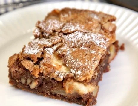 Mix 1 cup sugar, 1/2 cup butter, 1 egg, 1 1/2 cup flour, 1 tsp baking soda, 1 tsp cinnamon, and 1/2 cup strong brewed coffee. When thoroughly mixed, add 2 cups raw peeled and sliced apples and mix again. Put batter in baking pan and sprinkle with sugar and nuts. Bake at 350 degrees for 30-35 minutes.